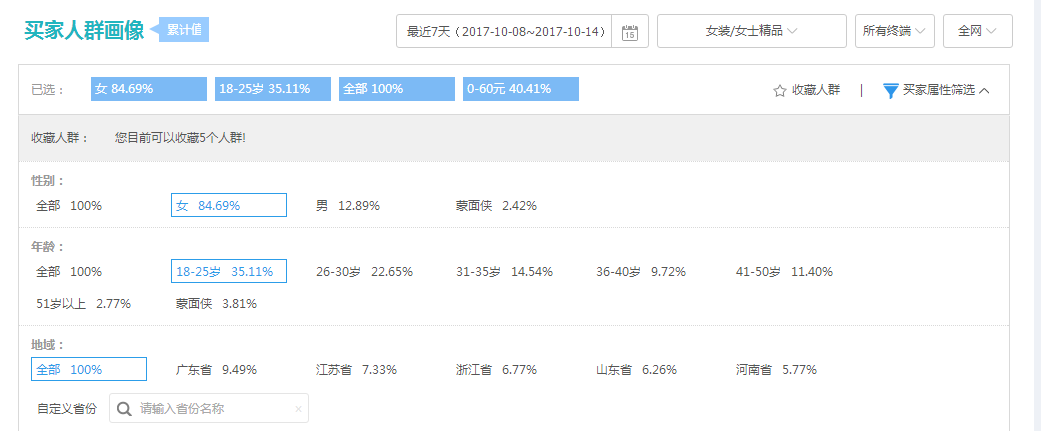 我们可以从风格、年龄、性别、类目笔单价和月经消费额度上去圈定符合自己宝贝的人群。